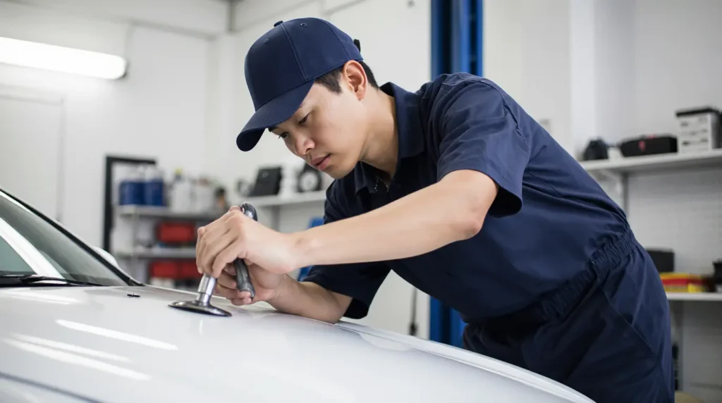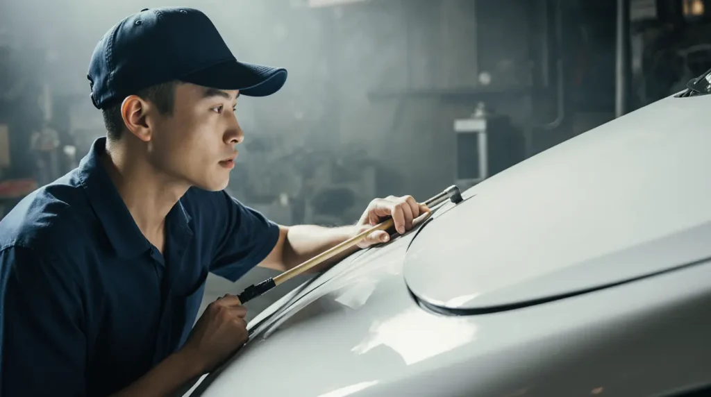 エクボ直しは、自動車のボディにできた小さなへこみを、パテや再塗装を行わずに元の状態に近づける修理方法です。専用の工具を使い、裏側から少しずつ金属を押し出すことで、短時間で美しく仕上げることができます。塗装をそのまま残すため、仕上がりが自然でコストも抑えられるのが大きな特徴です。